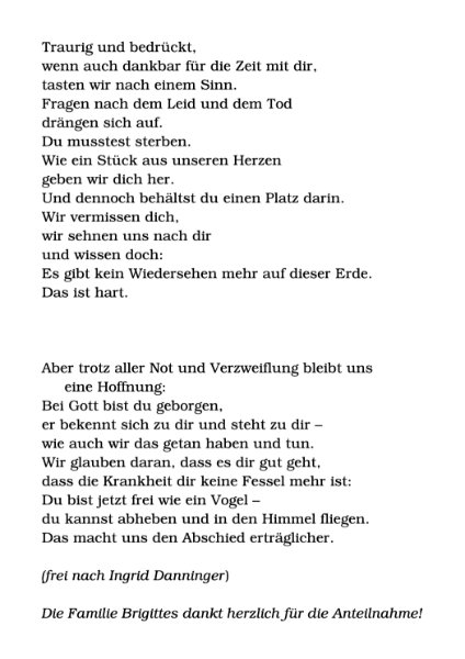 Herzlichen Dank für alle bereits eingetroffenen Beileidschreiben. Ich werde mich in jedem einzelnen Fall nach dem Begräbnis noch individuell bedanken. In tiefer Trauer eb