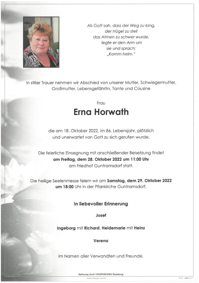 Erna Horwath bleibt uns als liebenswerte Gesprächspartnerin in Erinnerung, durften wir sie doch bei euren familiären Feierlichkeiten kennenlernen. Stets war sie offen und herzlich bei unseren Begegnungen. Wir erinnern uns gerne an Begegnungen und Momente mit ihr. Ich wünsche euch bewahrt sie in euren Herzen mit Erinnerungen an das gemeinsam Gute. Alles Liebe Margarete